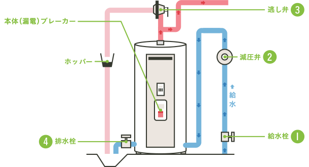 - 3吸気を確保するため、お湯側の蛇口を1~2箇所開け(台所、洗面所など)逃し弁③も『開』にします。